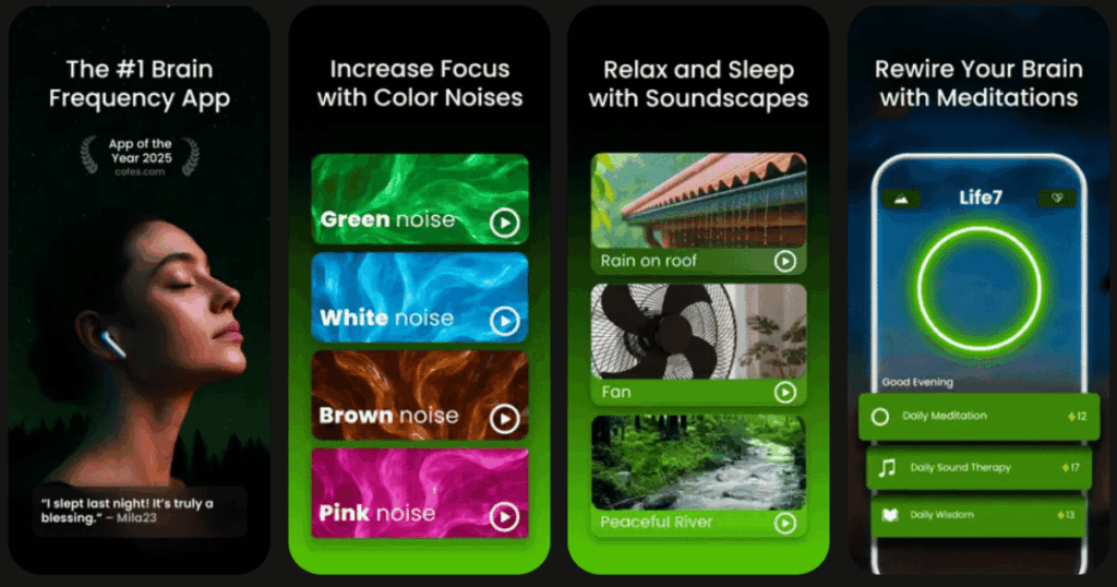 The app helps with meditation, focus, and sleep. It uses scientifically proven frequencies to guide your brain into desired states.