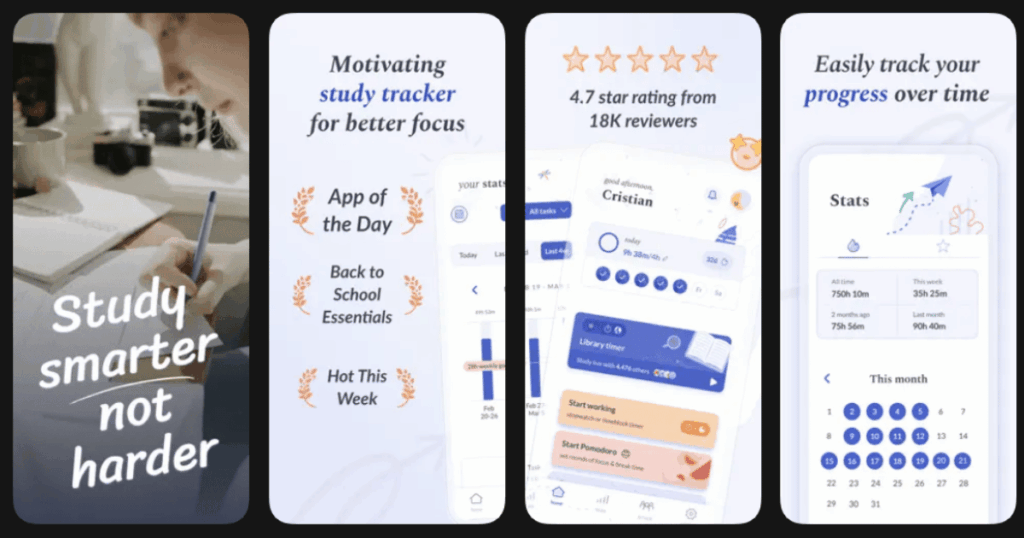 The app includes community features where you can focus alongside others. Work together in public study rooms and clubs to feel motivated and supported by a positive community.