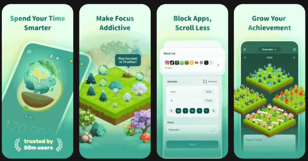 The app uses the Pomodoro technique. You set timers between 10 minutes and 2 hours. As you complete sessions, you build your own virtual forest. Over time, your forest shows how much focused work you have done.