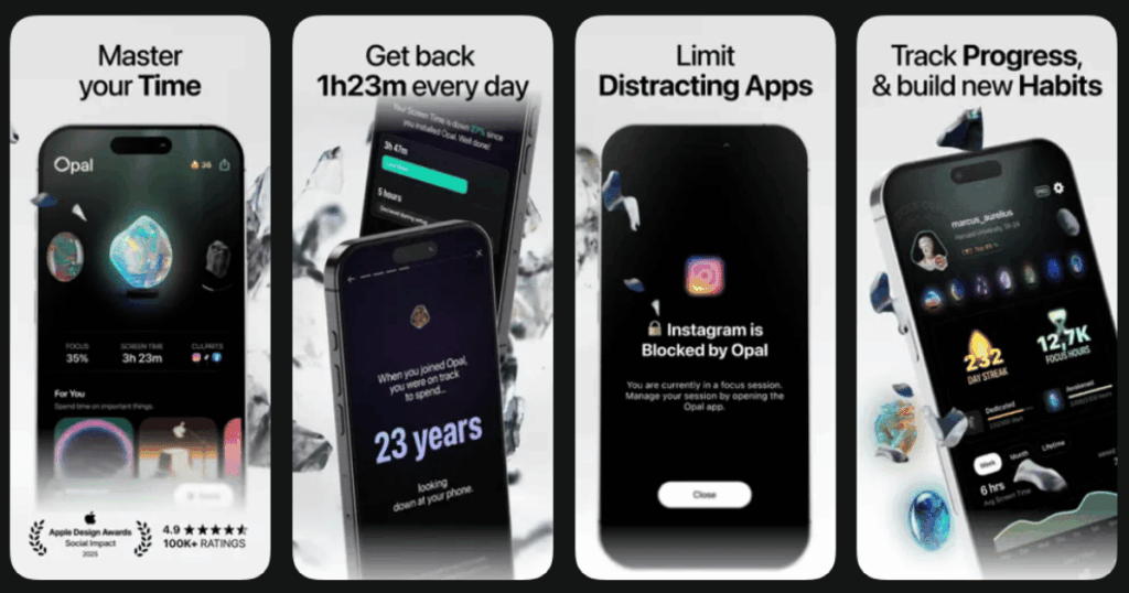 OpalScreen Time ControlDeep Focus mode, gamified tracking, leaderboards4.3/5Free version, premium subscription