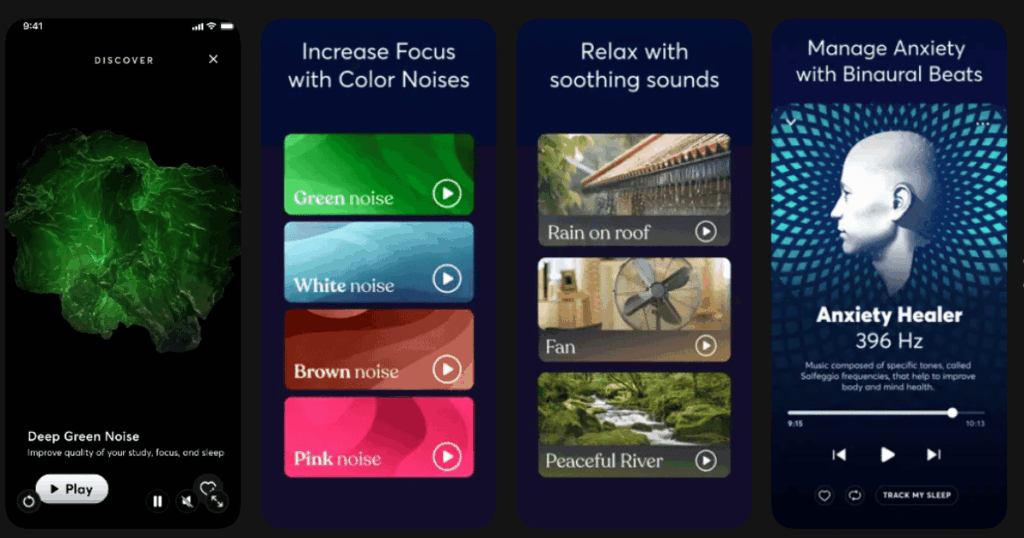 - Multiple sound options including green noise, white noise, brown noise, binaural beats, and solfeggio frequencies