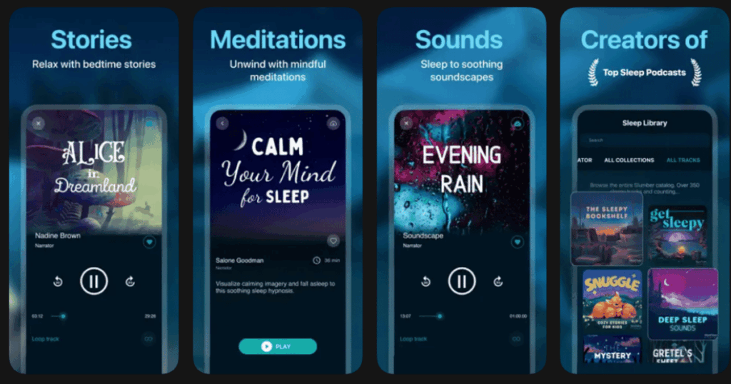 Slumber focuses entirely on storytelling for sleep. The stories are long and immersive. They are designed to slowly fade in volume and complexity. This guides your brain into sleep mode naturally.