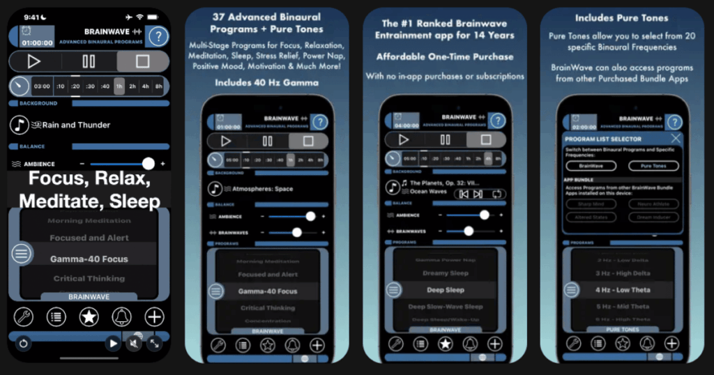 • 37 multi stage binaural programs for sleep, focus, memory, and more
