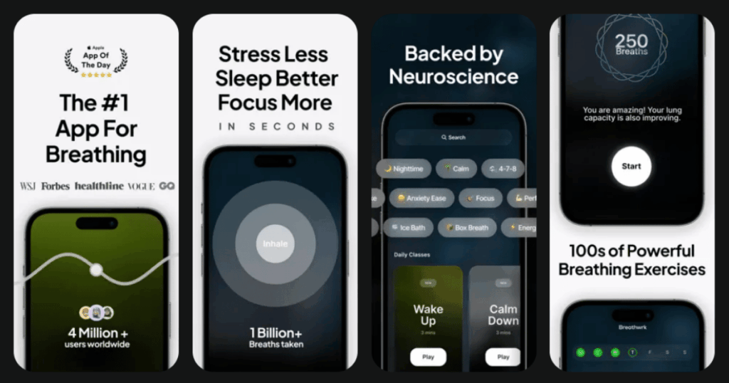 | Breathwrk | Breathing Exercises | 100+ guided exercises, habit tracking, challenges | 4.4/5 | Free version, premium subscription |