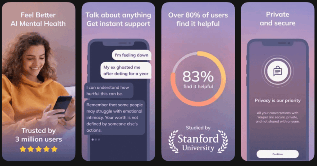 Youper is another AI-powered mental health app. It uses CBT techniques delivered through a friendly chatbot. Stanford University research found that over 80% of users felt better after using it.