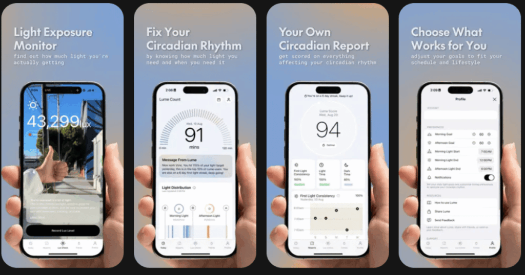 | Lume | Light exposure monitoring | Lux tracking, circadian health scoring, personalized goals | 4.1/5 | Free with optional premium |