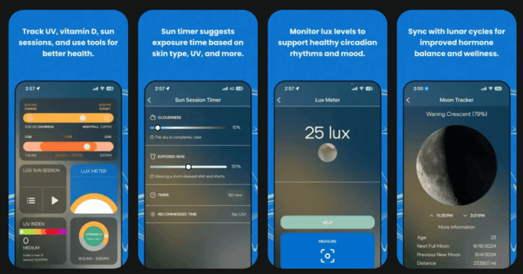 | MyCircadian | Location based circadian optimization | Real time sun data, lux meter, vitamin D tracking | 4.3/5 | Free with premium features |