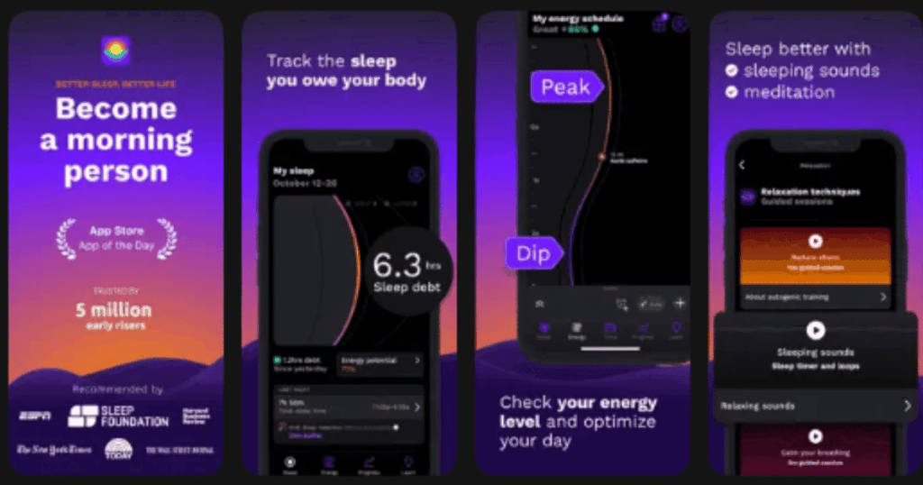 | RISE | Tracking sleep debt and energy levels | Circadian rhythm prediction, sleep debt tracking, energy schedule | 4.6/5 | Free trial, then yearly subscription |