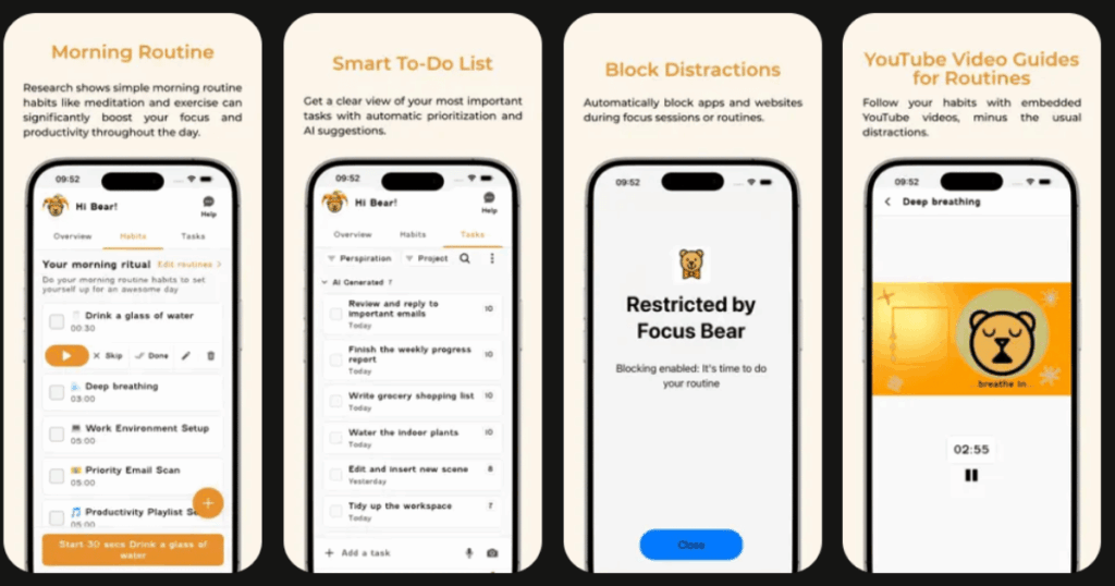Focus BearBuilding productive daily routinesHabit tracking, website blocking, Pomodoro technique4.1/5Free trial, then subscription-based