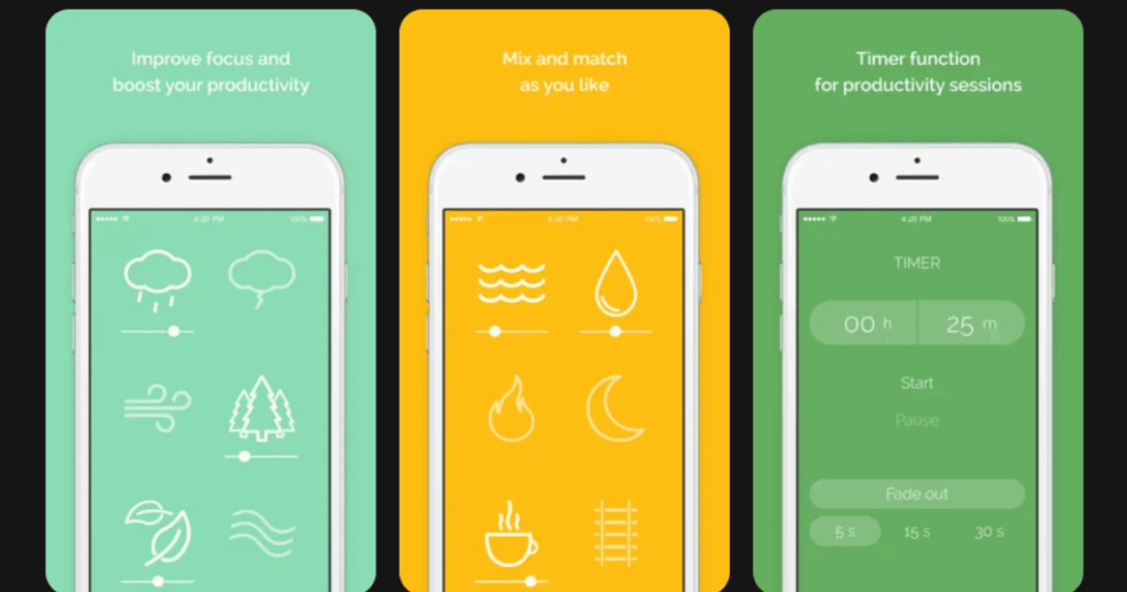 NoisliAmbient sound mixing for focusCustomizable soundscapes, built-in timer, offline mode4.2/5Free tier available, Pro subscription