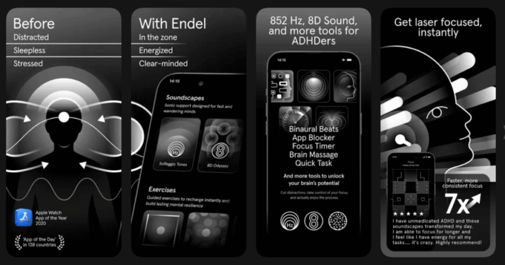 The app was Apple Watch App of the Year in 2020. Studies show Endel provides a 7x increase in focus compared to regular playlists. The sound never repeats, so your brain stays engaged.