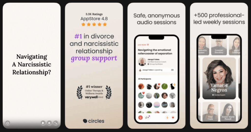 | Circles | Divorce support group therapy | Live audio groups, expert facilitators, peer connection | 4.3/5 | Free trial, subscription plans |