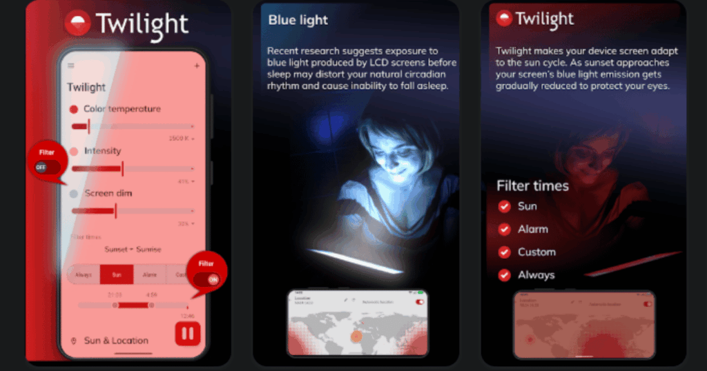 Twilight is a simple app with one important job. It filters the blue light from your phone screen. Blue light can mess with your sleep hormones, so reducing it at night helps.