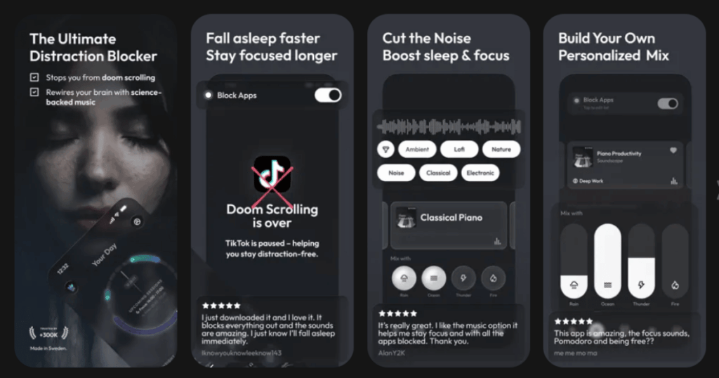 Soundscape combines science backed sounds with practical productivity tools. The app includes an app blocker to create distraction free zones during work sessions. You can connect your Apple Music or Spotify account to blend ambient sounds with your favorite music.