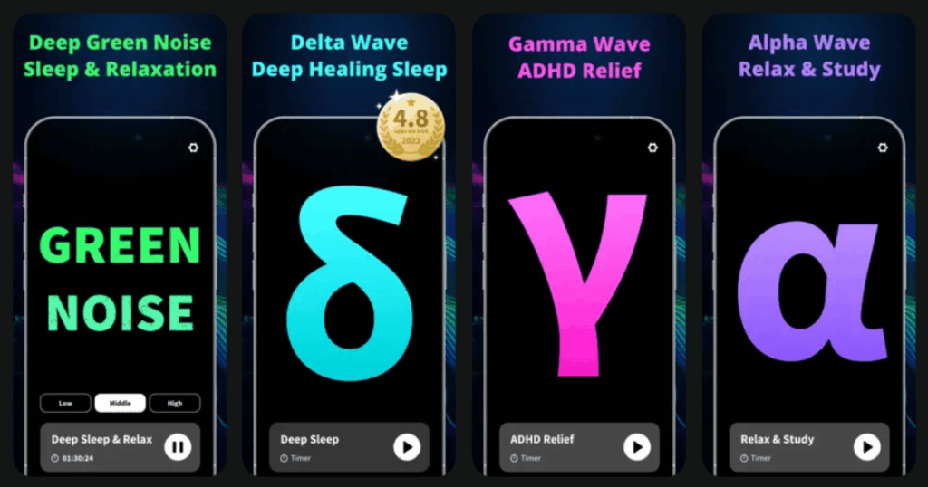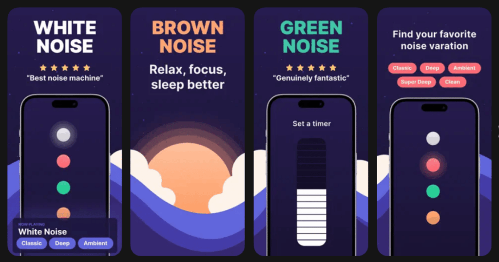 - Multiple noise colors including deep green noise and super deep brown noise