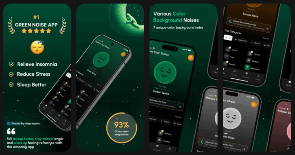 ZenTones was built specifically for green noise lovers. This app blends nature sounds with soothing ambient tones to help you achieve deep and restful sleep. The design is simple and clean which many users appreciate.