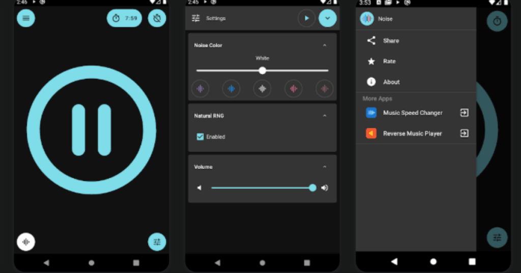 | Noise: Green, Brown, White | Real time noise generation | True audio generation, mix noise sounds, low battery usage | 4.8/5 | Free with optional premium |