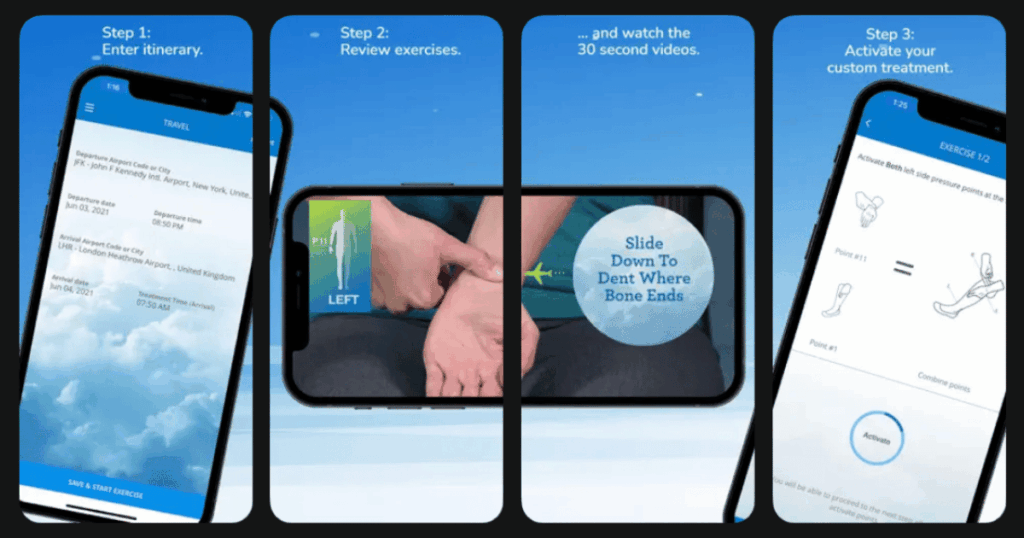 You input your flight details and the app calculates which two pressure points to use. There are over 100 combinations depending on your specific trip. Users report surprisingly good results even though the method sounds unusual.