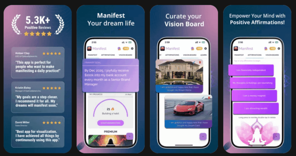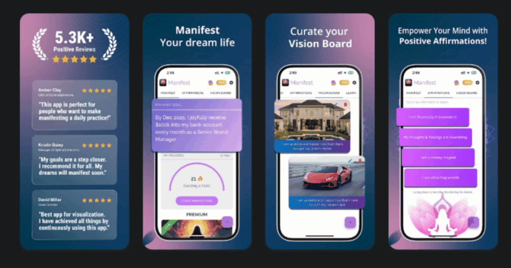 The Manifest App combines vision boards, daily affirmations, and goal tracking into one organized system. It was created specifically to help people apply the law of attraction in a practical, structured way.