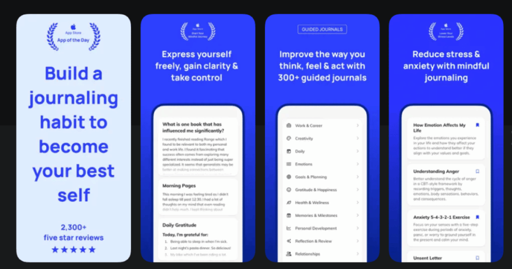 | Stoic | Philosophy based mental health journaling | Daily prompts, mindfulness exercises, themed weeks | 4.6/5 | Free version, premium available |
