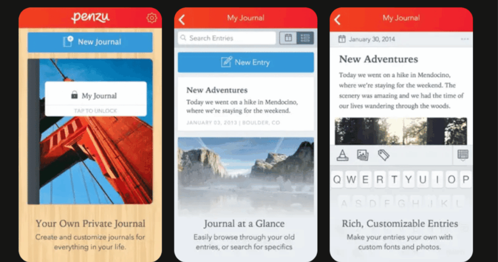 | Penzu | Maximum privacy journaling | Military grade encryption, classic diary feel, customizable themes | 4.2/5 | Free version, pro subscription |