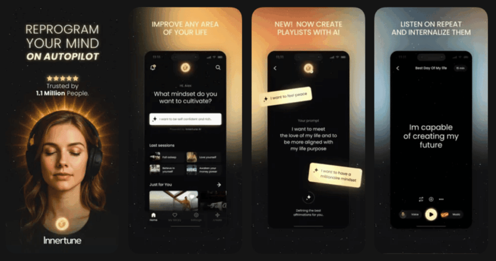 | Innertune | Large free affirmation library | 22,000+ affirmations, custom voices, offline access | 4.6/5 | Mostly free, premium optional |