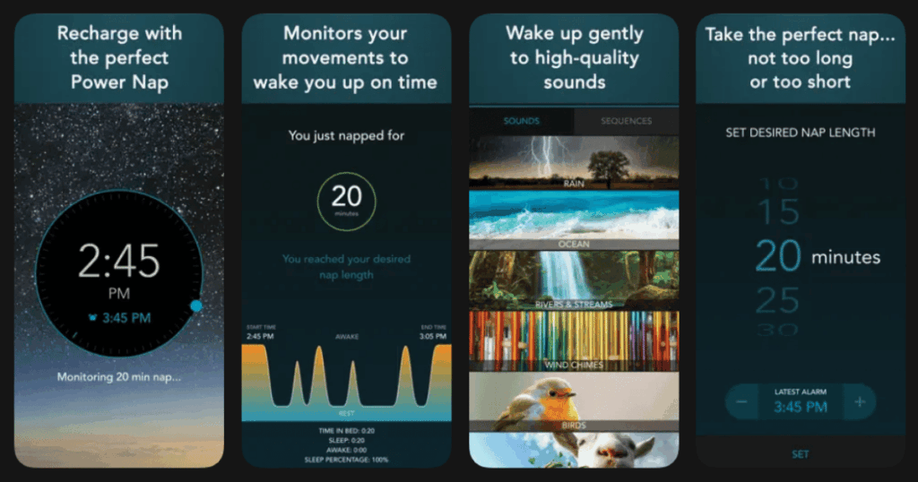 | Power Nap Tracker | Monitoring nap quality | Movement tracking, nap graphs, natural alarm sounds | 4.3/5 | Free with in app purchases |