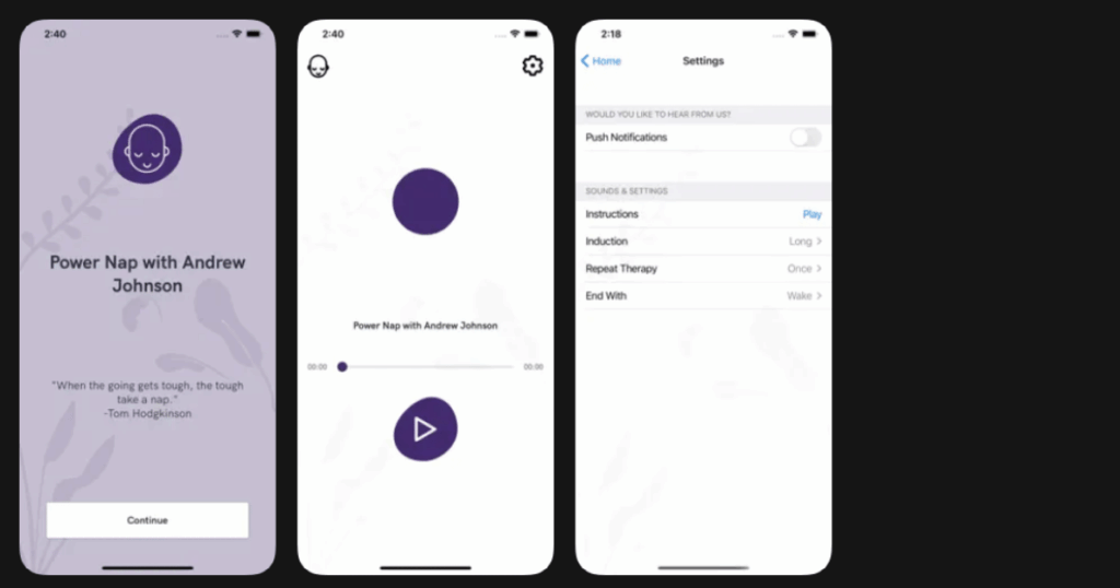 | Power Nap with Andrew Johnson | Guided relaxation during naps | Voice guided sessions, relaxation techniques, short format | 4.3/5 | Free base app, additional sessions available |