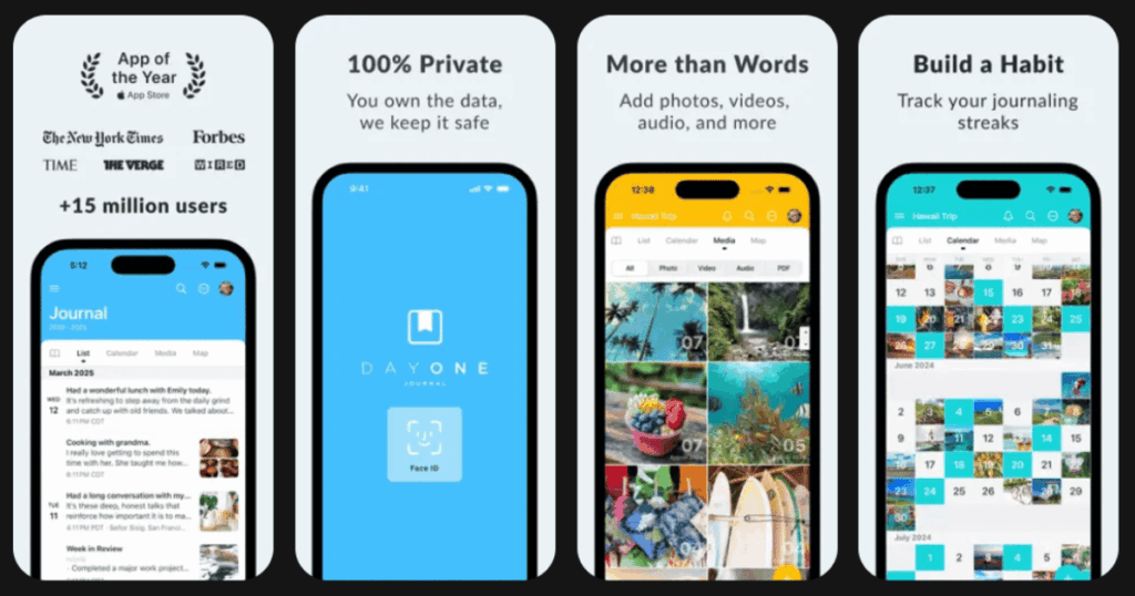 Day OneMultimedia journalingPhoto/video entries, encryption, cloud sync4.7/5Free with premium option