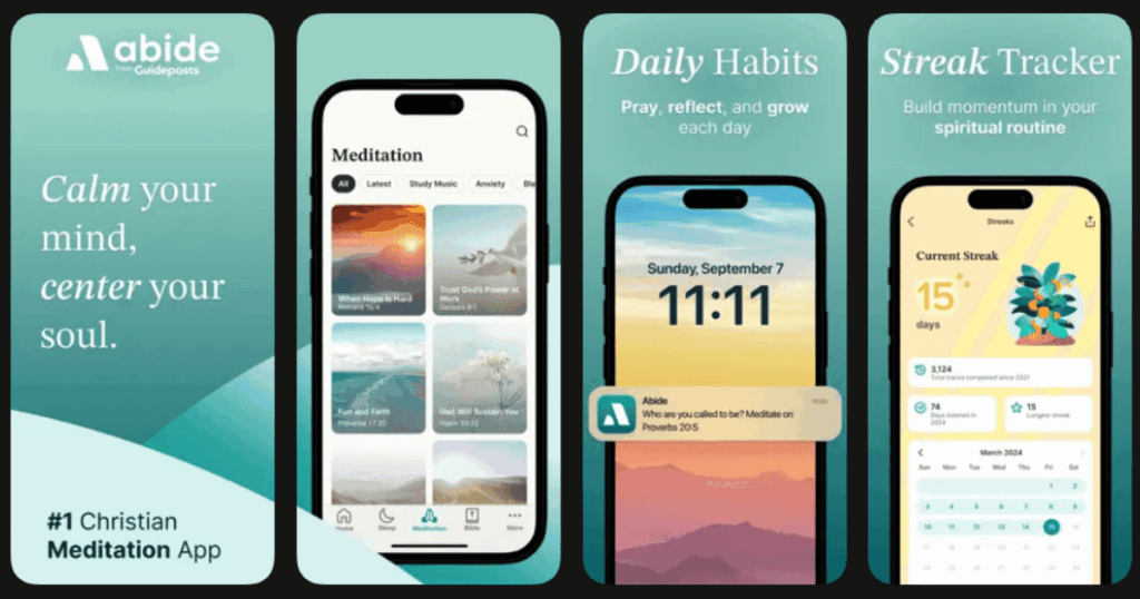 | Abide | Bible based meditation | Scripture meditations, prayer topics, calming sounds | 4.5/5 | Free trial, then subscription plans available |
