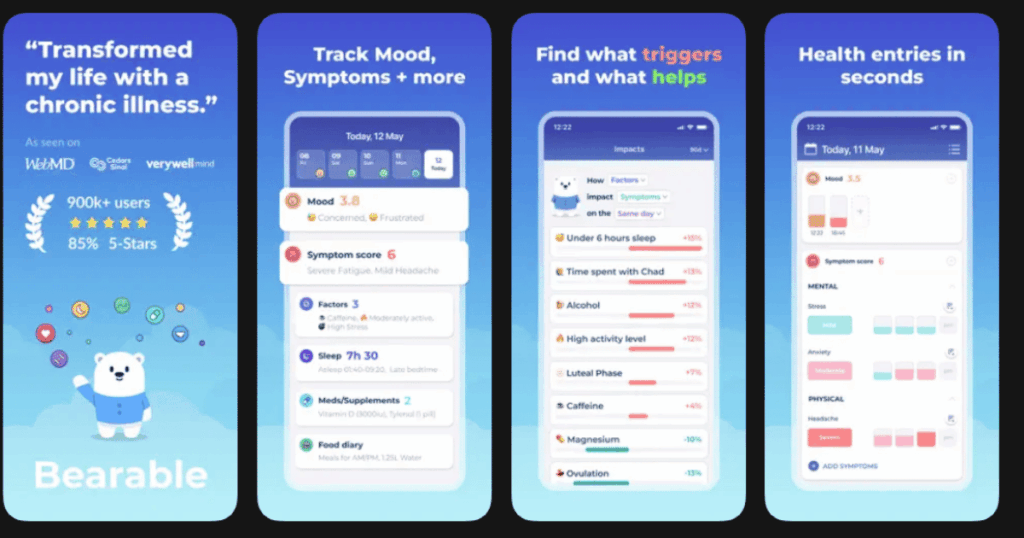 BearableMood and symptom trackingDetailed tracking, charts, insights4.4/5Free version, premium available