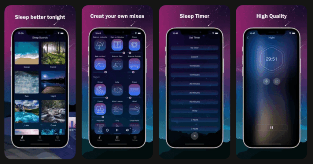 | BetterSleep | Creating custom sound mixes | 300+ sounds; sleep tracking; bedtime stories | 4.6/5 | Free version, premium subscription |